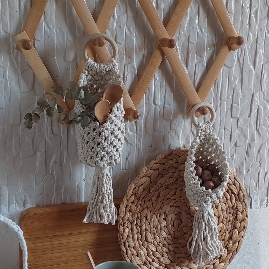 آویز مکرومه کاربردی که میتوانید داخلش گردو و خشکبار بریزید یا وسایل ریز آشپزخانه را در آن قرار دهید. ترکیب زیبا با حصیر و بامبو.